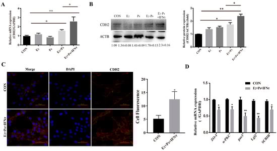 Hormones and/or IFNτ induced the PMT of gEECs. (A) mRNA level of CDH2 with E2, P4, or/and IFNτ treatment; (B) Western blot and quantitative analysis results of CDH2 with E2, P4, or/and IFNτ treatment; (C) representative images and analysis of CDH2 expression, scale bar = 50 μm; (D) mRNA levels of polarity-related genes: ZO-1, α-PKC, Par3, Lgl2, and SCRIB. * p < 0.05; ** p < 0.01.