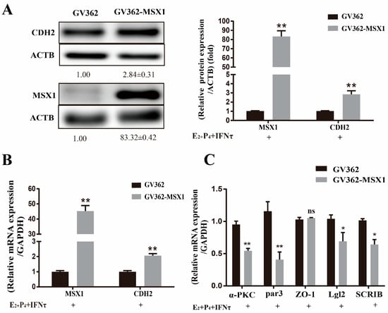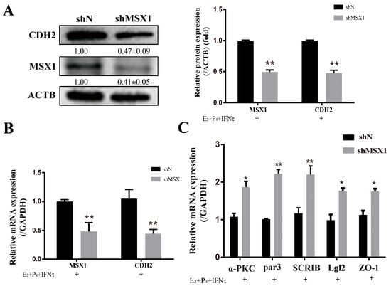 The knockdown of MSX1 decreased the expression of CDH2 with E2, P4, and IFNτ treatment in the gEECs (Figure 5A,B, p < 0.01), and the mRNA expression of the polarity markers (ZO-1, α-PKC, Par3, Lgl2, and SCRIB) was upregulated to various degrees (Figure 5C, p < 0.05).