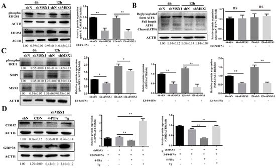 MSX1 regulated the expression of CDH2 via the ER stress-mediated UPR pathway. (A) Western blot and analysis results of EIF2S1and phosphoEIF2S1; (B) Western blot and analysis results of the cleaved and deglycosylated forms of ATF6; (C) Western blot and analysis results of phosphoIRE1 and XBP1; (D) shMSX1 EECs were treated with P4 and E2, and they were pretreated with TG or 4-PBA followed by treatment with IFNτ for 6 h, showing the Western blot and quantitative analysis results of GRP78 and CDH2. ns: p > 0.05; * p < 0.05; ** p < 0.01.