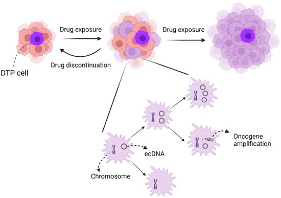 Several genetically acquired alterations, such as EGFR T790M or MET amplification, may be obtained during the DTP state. A conformational shift in the kinase known as EGFR T790M lowers drug affinity for the target. Target amplification, such as MET amplification, may also reduce the drug’s potency by outpacing its capacity for inhibition. Thus, the DTP state could serve as a repository for the cultivation of drug-resistant cells [62].