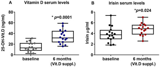 Despite abundant evidence on the prevalence of hypovitaminosis D in patients with PHPT, some uncertainty prevailed regarding whether hypovitaminosis D should be treated in these patients, particularly because the resulting increase in vitamin D concentration might have a negative feedback on PTH production and secretion. However, our results show that PTH circulating levels after 6 months of vitamin D treatment were slightly reduced compared to baseline. In agreement with this result, a meta-analysis of 10 studies comprising 340 patients showed that vitamin D supplementation in patients with PHPT significantly reduced PTH values without causing hypercalcemia and hypercalciuria, and another study demonstrated that normalization of vitamin D nutritional status resulted in significant reductions in PTH levels without any safety concerns [16]. However, a limitation of this study is the small number of patients analyzed. Future studies involving a larger number of patients with PTPH, as well as a longer duration of treatment, will be needed to demonstrate that vitamin D treatment may be a therapeutic application for PHPT, or that it may result in an increase in circulating serum irisin.