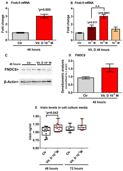 Treatment with vitamin D increases Fndc5 mRNA expression after 48 h (A). The lowest effective dose of vitamin D for increasing Fndc5 was 10−8 M (B). Western immunoblotting (C) and densitometric quantitation (D) of Fndc5 expression in myoblasts after 48 h of treatment with 10−8 M vitamin D, normalized to control loading (β-actin) (Western blot image of n = 3 Ctr and n = 3 vitamin D treated samples). Data are presented as mean ± SEM. Unpaired t-test (A–D) and ANOVA (B) were used to compare the groups. Levels of irisin measured by ELISA assay in cell culture media from myoblasts treated for 48 and 72 h with 10−8 M vitamin D (E). Data are presented as box-and-whisker plots with median and interquartile ranges, from max to min, with all data points shown. The Kruskal–Wallis test is used to compare groups. p value as indicated; * significant p value; n.s. not significant.