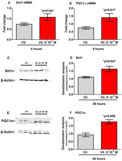 Recent evidence has shown that Sirt1 increases the transcription of the Pgc1α gene [18,19], which in turn is the master regulator of Fndc5 gene expression [2]. Therefore, to explore possible mediators involved in the vitamin D/irisin pathway, we treated myoblasts with vitamin D for a shorter time-course than that required to induce the upregulation of Fndc5. Our results showed that 8-h stimulation with vitamin D significantly increased the expression of Sirt1 mRNA (p = 0.041) (Figure 3A) and its protein level (p = 0.047) (Figure 3C,D) and the expression of Pgc1α mRNA (p = 0.017) (Figure 3B) and its protein level (p = 0.009) (Figure 3E,F) in skeletal muscle cells.