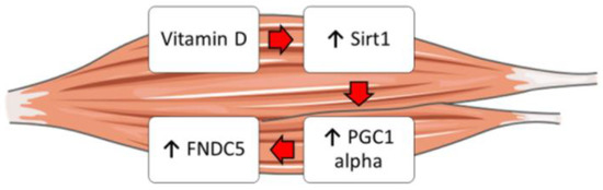 Moreover, it is well known that vitamin D enhances myogenic differentiation [27]. Irisin also has myogenic effects, promoting hypertrophy through activation of satellite cells and increasing protein synthesis [28]. Overall, our findings might explain these overlapping effects and suggest that vitamin D could increase Fndc5/irisin synthesis by enhancing the expression of Sirt1 and Pgc1a in skeletal muscle cells (Figure 5). Furthermore, these studies might support the fascinating idea that vitamin D possibly acts through irisin to promote myoblast differentiation and function.