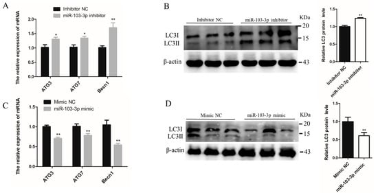 - Zhang, C.; Wang, H.; Qi, Y.; Kan, Y.; Ge, Z. Effects of miR-103a-3p on the autophagy and apoptosis of cardiomyocytes by regulating Atg5. Int. J. Mol. Med. 2019, 43, 1951–1960. [Google Scholar] [CrossRef] [PubMed]