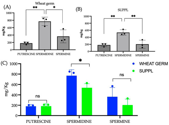 - Truzzi, F.; Whittaker, A.; D’Amen, E.; Tibaldi, C.; Abate, A.; Valerii, M.C.; Spisni, E.; Dinelli, G. Wheat germ spermidine and clove eugenol in combination stimulate autophagy in vitro showing potential in supporting the immune system against viral infections. Molecules 2022, 27, 3425. [Google Scholar] [CrossRef]