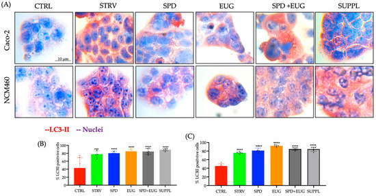 2.2. Effects Spermidine and Eugenol Treatments on Autophagy LC3-II Marker Detection and Tolerability in Caco-2 and NCM460 Cell Lines