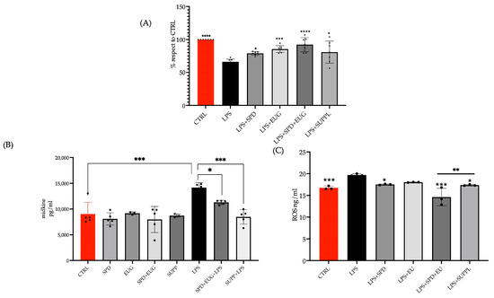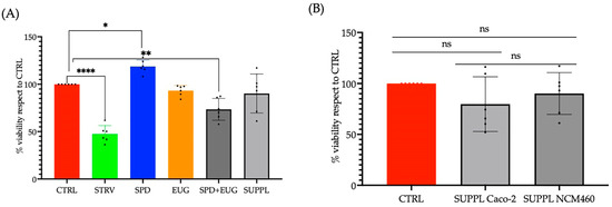 2.6. Effect of Spermidine plus Eugenol and Supplement Pretreatments in Reconstituted Caco-2 Intestinal Equivalents Exposed to Liposaccharide