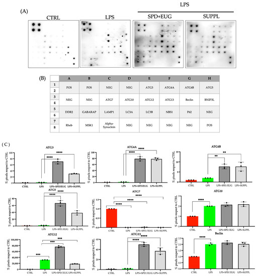 2.4. Effect of the Spermidine and Eugenol Combination and Supplement Pretreatments on the Expression of Autophagy Microarray Expression in NCM460 Cells Treated with Lipopolysaccharide