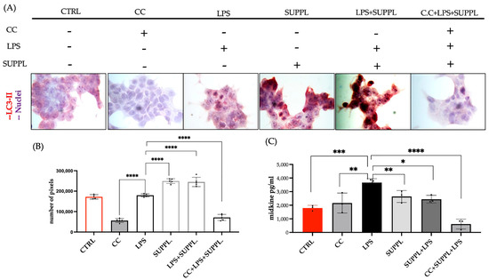 4.10. Autophagy LC3-II Marker, Occludin, and Mucus Detection in a Reconstituted Intestinal Cell Model with Caco-2, U937, and L929 Cells