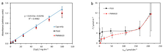 Adsorption data were obtained as mean values of three individual experiments at a wavelength of 279 nm and shown in Figure 1. Good linearity was noted for absorbance of cypermethrin over a wide range of concentrations at the selected wavelength (R2 = 0.9982), while absorbance measurably decreased after addition of PS and PMMA microparticles, indicating removal of cypermethrin from solution (Figure 1a).
