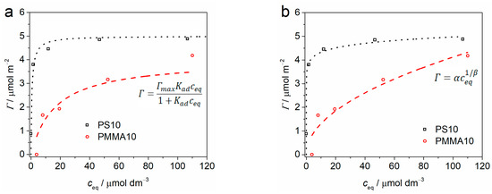 (a) Langmuir and (b) Freundlich adsorption isotherms for cypermethrin on 10 μm polystyrene (PS10) and polymethylmethacrylate (PMMA10) microparticles.