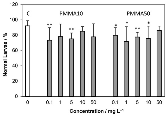 Percentage (mean ± SD) of normally developed plutei larvae after 72 h exposure to various concentrations of 10 and 50 μm PMMA microparticles (C—control). * p < 0.05, ** p < 0.01.