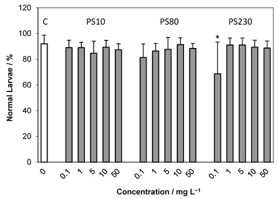 Exposure of developing embryos to PS microparticles with diameters of 10, 80 and 230 μm induced only a slight reduction in normal plutei with respect to control samples, to about 80–85%, with no clear trend evidenced with increasing microparticle concentration (Figure 4).