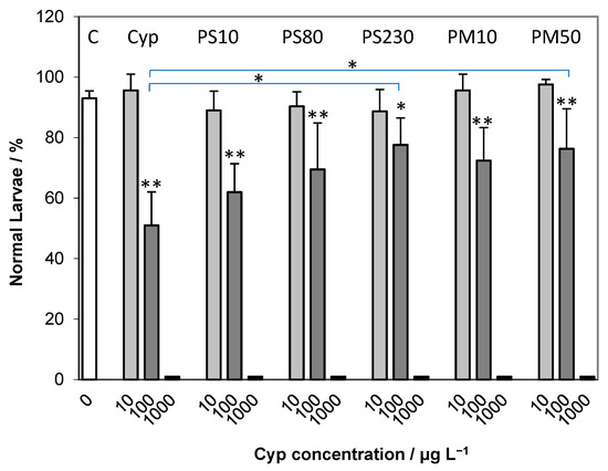 Percentage (mean ± SD) of normally developed plutei larvae after 72 h co-exposure to 50 mg L−1 microparticles and various concentrations of cypermethrin (C—control, Cyp—cypermethrin only). Significant differences compared to the control (** p < 0.01) are shown at the top of the columns, while significant differences compared to cypermethrin only (* p < 0.05) are denoted by the horizontal bars.