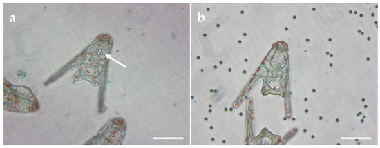 Representative images of A. lixula embryos with (a) ingested 10 μm PMMA microparticles (indicated by arrow) and (b) lack of ingestion after co-exposure to microparticles and cypermethrin (scale bar 100 μm).