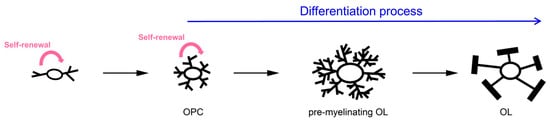 Scheme of the oligodendrocyte lineage cells. Note that early and later OPCs are capable of self-renewal, while more mature OL lineage cells are not.