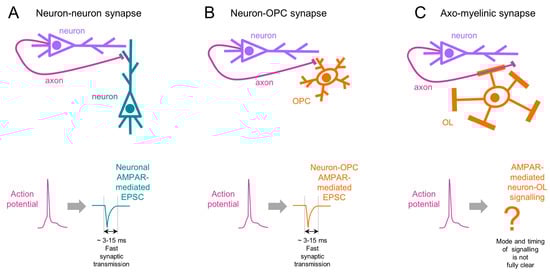 Timing of neurotransmission at (A) neuronal synapses, (B) neuron–OPC synapses, and (C) axo-myelinic synapses. The upper panels are a schematic drawing of the connections between (A) two neurons, (B) a neuron and an OPC, and (C) an axon and an OL. The corresponding lower panels show the action potential in the axons (spike in magenta colour), and the corresponding fast excitatory postsynaptic current (EPSC) at neuronal and neuron–OPC synapses (blue color). The mode of signalling at axo-myelinic synapses is not fully clear, but appears to be slower than at classical synapses.