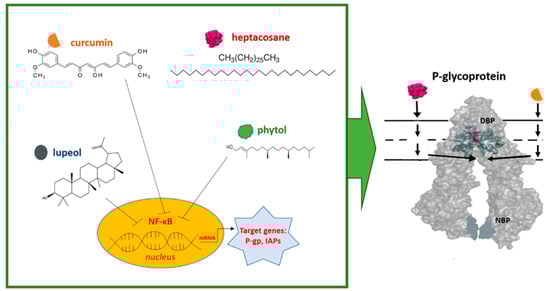 In particular, we present the mechanism of action of four natural substances belonging to different categories: terpenoids, polyphenols, and hydrocarbons. Phytol is acyclic hydrogenated diterpene alcohol, lupeol is a pentacyclic triterpenoid, curcumin is a polyphenol and heptacosane is a straight-chain alkane with 27 carbon atoms. All these compounds are capable of targeting P-gp by inhibiting its expression at the transcriptional level and/or by acting as substrate inhibitors of the same protein, yet they do so through different mechanisms.