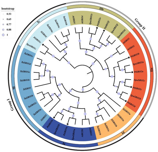 We identified a total of nine SRO family members (E-value < 1 × 10−5) from poplar by HMMER, which were named PtSRO (1a–1c,2a–2f) according to their homologous gene in Arabidopsis thaliana [25]. A phylogenetic tree of SRO family genes from poplar, Arabidopsis, Salix purpurea, Setaria italica, and Triticum aestivum was constructed using MEGA5.0 [26]. As shown in Figure 1, the SRO family members from the five plant species can be divided into two groups, Group I and Group II. Group I contains four clusters, including Ia to Id, while Group II contains two clusters, including II a and II b. Group I contained SRO family members from both monocotyledons and dicotyledons, while Group II contained SROs from dicotyledons. In Group I, Ia contains family members from dicotyledons; Ib and Id contain SROs from monocotyledons, while group Ic includes SROs from both monocotyledons and dicotyledons. It indicates that the SRO gene family is more evolved in monocotyledonous plants. All the SROs from poplar and Salix purpurea were found to be in the same branch. This indicates that the two species are more closely related, and SROs diverged with the evolution of the herbaceous woody plant. In addition, we found that all genes from all species in Ia contained the full three structural domains of SRO (Table S1), suggesting that this cluster of genes may perform a wider range of biological functions than others.
