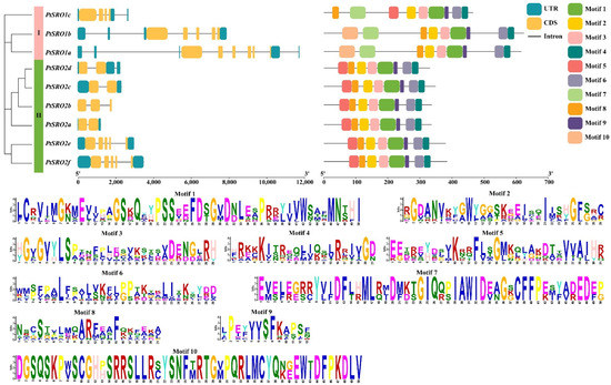 In addition, we analyzed their genetic structure using GSDS and MME online software. In general, the SRO genes that are in the same evolutionary branch have structural similarities. As shown in Figure 2, SRO2a–d belonged to Group II-a with 2–3 exons. SRO2e and SRO2f belonged to Group IIb with five exons. SRO1a and SRO1b belonged to Group Ia, with five and six exons, respectively. SRO1c belonged to Group Ic, with four exons. This indicates that the number of gene exons within each subgroup is close. Motif analysis reveals that all SROs in Group II contain the same motif and are similarly distributed. This indicates that all SROs in this group have strong similarities in gene structure. We also found that the SROs in Group I were also structurally similar. Overall, this corresponds to the results of our evolutionary tree and structural domain analysis.
