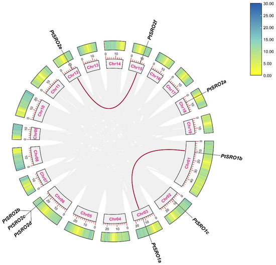 Collinearity analysis of the SRO gene family in poplar. Spectral and thermal profiles in the outer circles indicate gene density on chromosomes, with red and grey lines indicating fragment repeat gene pairs and co-linear blocks of SRO genes in the poplar genome, respectively.