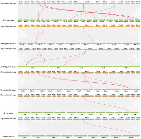 Collinearity analysis of the SRO genes from poplar and six other species. Poplar and other species share syntenic gene pairs in red and share orthologous genes in gray.