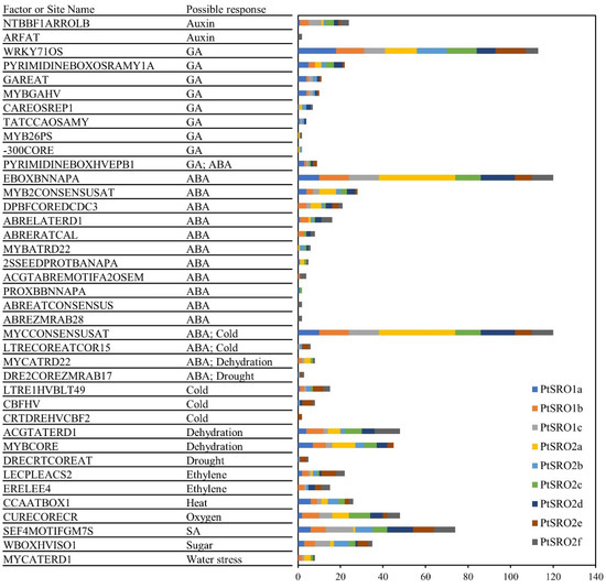 In this study, the cis-elements in the promoters of nine PtSROs were analyzed by PLACE [29]. As shown in Figure 5 and Table S4, the elements associated with stress response covered a wide range of family members. For example, four cis-acting elements related to resistance, such as drought response, low-temperature regulation, osmotic stress, and response to dehydration, were identified in the upstream sequence of most PtSROs. There were a total of 29 phytohormone-related elements identified, including acid response elements (ABRELATERD1, ABREATCONSENSUS, ABREZMRAB28, ABRERATCAL, etc.), salicylic acid response elements SEF4MOTIFGM7S, gibberellin response element (WRKY71OS, PYRIMIDINEBOXOSRAMY1A, GAREAT, MYBGAHV, etc.), ethylene response elements LECPLEACS2 and ERELEE4, auxin response elements NTBBF1ARROLB and ARFAT. The promoters of PtSRO2b and PtSRO2e contained the least elements, with 65 and 91 elements, respectively. Each PtSROs promoter contained abundant abscisic acid (ABA) response elements; for example, PtSRO2a contained 127 ABA-related elements with maximum magnitude. Elements associated with osmosis and drought stress were also widely distributed in PtSROs promoters. All these results indicate that PtSROs participate in plant growth and development and stress responses.