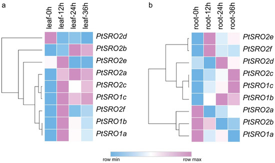 Expression pattern of poplar SRO genes. Pink represents high expression, and blue represents low expression. (a): Expression patterns of PtSROs in leaves at different time points under salt stress. (b): Expression patterns of PtSROs in roots at different time points under salt stress.