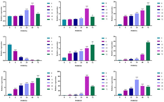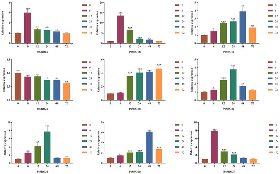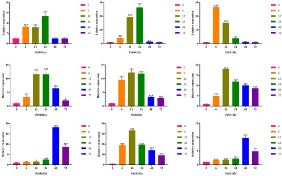 Expression patterns of PtSROs in response to ABA. X-axis shows stress treatment time points; Y-axis represents relative expression levels. The data was processed using the 2−ΔΔCt method. Transgenic lines and wild-type lines have significant differences indicated by asterisks in the error bars. (t test, * p < 0.05 ** p < 0.01 *** p < 0.001).