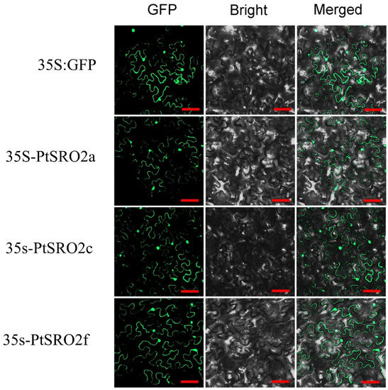 Subcellular localization of PtSRO2a, PtSRO2c, and PtSRO2f proteins. Using Agrobacterium-mediated transient expression, the control (35S-GFP) and fusion vectors (35S-PtSRO2a-GFP, 35S-PtSRO2c-GFP, 35S-PtSRO2f-GFP) were expressed in N. benthamiana leaves separately. Scale bar = 20 um.