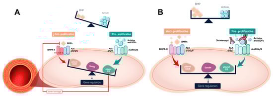 Pathogenic mutations in all the main domains of BMPR2 have been documented, and, although at a lower frequency, mutations in other related genes such as BMP9, BMP10, ALK, SMAD8/9 or endoglin have been observed in some studies, highlighting the importance of this axis for the pulmonary vasculature homeostasis [,,,]. Dysregulation of the BMP pathway leads to an imbalance between anti-proliferative and pro-proliferative routes (Figure 2A): decreased BMPR2 activity (anti-proliferative effects) causes reduced BMP9/10-mediated signaling, and thus increased apoptosis and reduced endothelial barrier integrity []. This promotes the production of activin A, growth differentiation factors (GDF) 8 and 11 that bind to the ALK (type-1 receptor)—activin receptor type IIA (ActRIIA, type-2 receptor) complex (from the TGFβ superfamily) and activate the pro-proliferative Smad2/3 pathway. This route also increases the expression of the BMP antagonists, gremlin and noggin, further downregulating the BMPR2 pathway [,,].