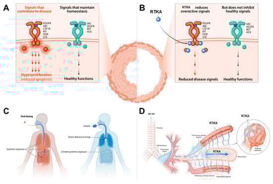 Tyrosine kinase receptor signaling. (A). Upregulation of the tyrosine kinase receptor PDGFR and its ligand, platelet-derived growth factor, which is the most potent mitogenic for vascular smooth muscle cells, has been observed in pulmonary arterial hypertension. Ligand binding of platelet-derived growth factor induces dimerization of the receptors followed by activation by autophosphorylation and downstream signaling and transcription of pro-proliferative genes. This leads to excessive proliferation of vascular smooth muscle cells in the arteriolar media and myofibroblasts in the vessel lumen, with media hypertrophy and intimal fibrosis. CSFIR and c-KIT are two additional PDGFR-related kinases that have also been involved in the pathobiology of PAH. CSF1R is expressed on monocytes and macrophages, which secrete platelet-derived growth factor ligands and inflammatory cytokines, promoting inflammation and remodeling of the pulmonary vasculature. C-KIT is expressed on endothelial progenitor cells and mast cells, and it is thought to play a role in perivascular inflammation and vascular remodeling. (B). RTKA reduce the upregulation of the pro-proliferative tyrosine kinase receptor-dependent signaling pathways. The RTKA imatinib inhibits PDGFR, DDR, c-KIT, CSF1R and ABL. The RTKA seralutinib inhibits PDGFR, CSF1R, and c-KIT, and increases bone morphogenetic protein receptor type-2. (C). Oral (left) and inhaled (right) administration of RTKA. (D). The inhaled formulation of the RTKA delivers high concentrations of the compound throughout the airways that reaches the pulmonary vasculature and the surrounding tissues to exert their anti-proliferative effects. ABL: abelson tyrosine kinase; CSF1R: colony stimulating factor 1 receptor; DDR: discoidin domain receptor tyrosine kinase; HCK: hematopoietic cell kinase; LCK: lymphocyte-specific protein tyrosine kinase; PDGFR: platelet-derived growth factor receptor; RET: rearranged during transfection tyrosine kinase; RTKA: receptor tyrosine kinase antagonist; SRC: sarcoma tyrosine kinase; VEGFR: vascular endothelial growth factor receptor.