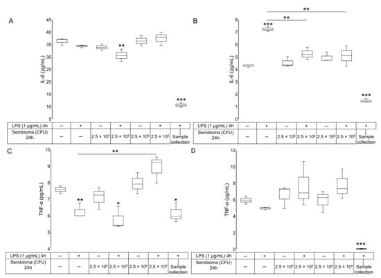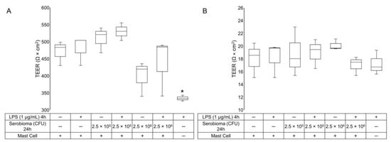 The cells were challenged with the LPS proinflammatory stimulus and then treated with the Serobioma multi-strain probiotic formulation. The transepithelial electrical resistance (TEER) measurement was used to evaluate the barrier function of the cellular layers [], while the inflammatory response was assessed by measuring cytokine production.