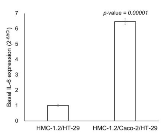 The levels of IL-6 mRNA in HMC-1.2 was analyzed by RT-qPCR. As shown in Figure 4, when cells were interfaced with the Caco-2/HT-29 co-culture, about a 7-fold increase in the expression of IL-6 was observed (p-value = 0.00001).