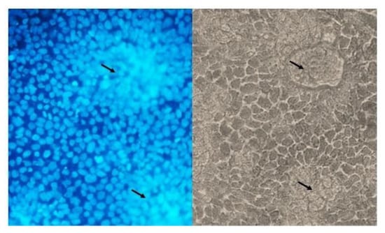 Microphotograph of the Caco-2/HT-29 co-culture seeded on the Transwell insert at a 9:1 ratio and cultured for 18 days. Morphological features were examined with DAPI staining (on the left). Black arrows indicate HT-29 clusters inside the differentiated Caco-2 cell monolayer, 20× magnification.