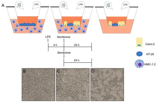 Schematic representation of the Transwell co-culture models (A). Microphotograph of 7-day confluent HT-29 (B), 18-day Caco-2/HT-29 co-culture (C), and HMC-1.2 (D), 20× magnification.