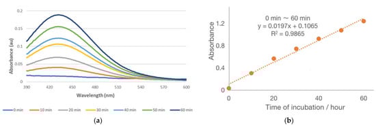 (a) UV–visible spectra recording the hydroxylation of NPBG at 10 min intervals of incubation times over a period of 1 h. (b) Variation of the yield of hydroxylated product of NPBG with time. H2O2 was added to a solution of NPBG (1 mM) and iron(III)-EDTA (0.5 mM) in sodium tetraborate (25 mM, pH = 8.0) to obtain a final concentration of H2O2 of 5 mM.