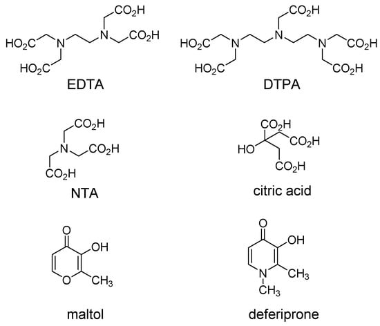The following ligands were compared: EDTA (ethylenediaminetetraacetic acid), DTPA (diethylenetriamine pentaacetate), NTA (nitrilotriacetic acid), citrate, maltol, and deferiprone (Figure 2). The range of log affinity constants for iron(III) fell between 35.7 and 11.4, and for iron(II), it fell between 16.4 and 4.4 (Table 1). Under the conditions of the study, the rates of hydroxylation ranged from 13.59 to 0.37 mol h−1.
