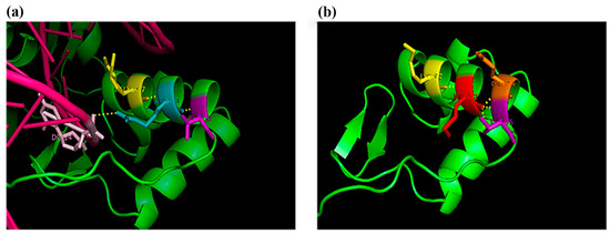 Detail of the 3D structures by PyMol visualization. (a) wild-type PAX5 paired-box domain with DNA interaction retrieved from PDB 1k78 structure: Arg71 (light blue) is the conserved amino acid; (b) 3D structure of PAX5 paired-box domain, elaborated by SWISS-MODEL prediction tool: the amino acid variant Met71 (magenta) seems to change the orientation of the alpha helix.