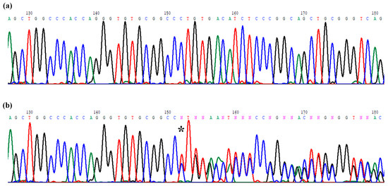 Chromatograms related to the sequence variation indel c.153_155delCTGinsTT. (a) the forward sequence of exon 2 wild type. (b) the forward sequence with the variations: the star (*) indicates the starting CTG nucleotides deletion and the TT insertion.