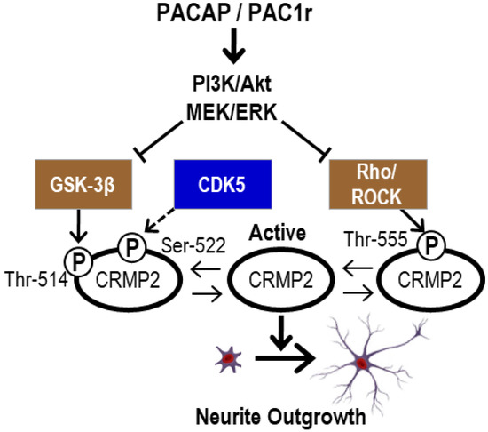 Using RT-PCR, two-dimensional gel electrophoresis, in conjunction with Western blotting and inhibitor experiments, it was shown that neurite protrusion elongation by PACAP38 (10−7 M) in PC12 cells is mediated through the PAC1-R receptor, as demonstrated by its suppression by a specific inhibitor PA-8 [12]. These studies suggested that CRMP2 may be involved in the neurite projection elongation effect of PACAP, and the molecular mechanism was investigated in an in vitro inhibitor experiment using PC12 cells. The results showed that the projection elongation effect of PACAP is mediated by Pac1 receptor-mediated PI3K/AKT and MEK/ERK as the main pathways. Furthermore, the dephosphorylation of CRMP2 by PACAP was shown to be important for projection elongation, and since it has been reported that CRMP2 becomes inactive by phosphorylation of Thr-514, Ser-522, and Thr-555 sites by GSK-3β, CDK5, and Rho/ROCK [13,14,15,16], we investigated neurite projection elongation by PACAP and dephosphorylation of CRMP2. The results showed that the MEK/ERK inhibitor U0126 strongly suppressed projection elongation by PACAP, with no dephosphorylation of CRMP2. Thus, it is possible that MEK/ERK regulates GSK-3β, ROCK, and CDK5.
