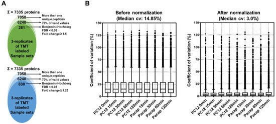 For the in-depth proteome analysis, TMT-labeled peptides were fractionated into 12 fractions by a basic pH-reversed phase using in-house developed stage-tips. The LC-MS/MS analysis led to the identification of 73,958 peptides and 62,854 unique peptides that matched with 7335 protein groups, with an average sequence coverage of 26.2% (Figure 3A, and Supplementary Tables S1 and S2). The removal of potential contaminants and proteins with missing values (three valid values in the three replicates at of least one group) reduced the number of identified proteins to 6240 (Figure 3A). The normalization of protein intensities across all the TMT sets was carried out by the internal reference scaling (IRS) method, which improved the coefficient of variation (CV) values from 14.85% to 3.0% (Figure 3B, and Supplementary Tables S1 and S2).