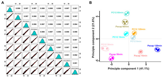The PC12 cells (RCB0009) were obtained from the RIKEN Cell Bank (Tsukuba, Japan). Cells were cultivated in RPMI medium 1640 (ATCC Modification, Thermo Fisher Scientific, Grand Island, NY, USA) in a CO2 incubator (37 °C, 5%) with 5% fetal bovine serum (FBS) (16140063, Gibco, Billings, MT, USA), 10% horse serum (HS) (H1138, SIGMA, St. Louis, MO, USA), and antibiotics (penicillin-streptomycin, P4458, Sigma, St. Louis, MO, USA). Cellmatrix Type IV (Nitta Gelatin Inc., Osaka, Japan) was used to coat the culture dish. PC12 cells cultured in 10 cm sterile culture dishes were incubated for 24 h, and PACAP38 10−7 M was added post-incubation. PC12 cells after 5, 10, 15, 30, 60, and 120 min post-incubation from PACAP38 addition were used for total RNA extraction for DNA microarray analysis [9,10,11,12]. Similarly, PC12 cells after 15, 30, 60, and 120 min of incubation from PACAP addition were used for total protein extraction for proteomic analysis [9,10,12].