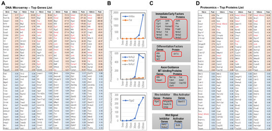 Top 20 genes and proteins whose expressions were altered by PACAP in the PC12 cells. (A) List of the top 20 genes whose expression was altered by DNA microarray analysis at 5, 10, 15, 30, 60, and 120 min after the addition of PACAP. (B) Expression changes of Inhba, Fst, NR4A1,2,3, and Rgs2 genes. Gene expression levels (ProcessedSignal) on the vertical axis are expressed as Fold (PACAP treatment/Control) values. (C) Top 20 genes and proteins with altered expression by PACAP, categorized as Initial Early Factors, Differentiation factors, Axon guidance, MT-binding proteins, Rho inhibitor, and genes and proteins categorized as Initial Early Factors are shown in red (up-regulated) and blue (down-regulated) boxes. (D) List of the top 20 proteins with altered expression obtained by TMT-LC-MS/MS analysis at 15, 30, 60, and 120 min after addition of PACAP.