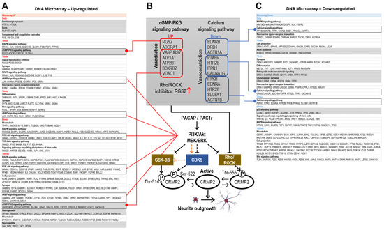 Categorical analysis using the DAVID tool of the genes (2.0-fold ≥, 0.5-fold ≤) whose expression was altered by PACAP obtained through the DNA microarray analysis. The categories mentioned in the discussion are in gray, and the categories thought to be involved in the Pac1r-mediated neurite projection elongation effect of PACAP shown in B are circled with black lines. (A) Categories of genes whose expression was increased by PACAP. (B) Genes categorized in the cGMP-PKG signaling pathway and Calcium signaling pathway that have functions of vasodilation and vasoconstriction may be involved in Rho/ROCK inhibition; red boxes, up-regulated genes; blue boxes, down-regulated genes. The red arrow indicates a strong up-regulation of the RGS2 gene. (C) Categories of genes whose expression was decreased by PACAP.