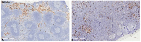 Representative microscopic images of S100A8/A9 expression in a normal cancer-draining lymph node (A) and a normal non-cancer-draining lymph node (B).