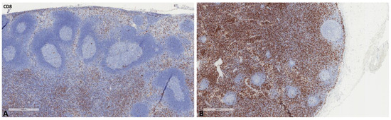Representative microscopic images of CD8 expression in a normal cancer-draining lymph node (A) and a normal non-cancer-draining lymph node (B).