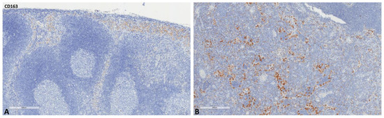 Representative microscopic images of CD163 expression in a normal cancer-draining lymph node (A) and a normal non-cancer-draining lymph node (B).