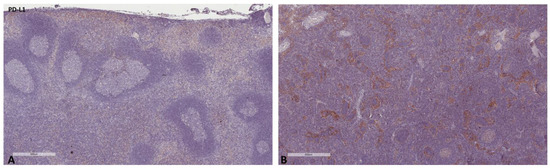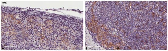 Representative microscopic images of PD-L1 expression (higher magnification) in a normal cancer-draining lymph node (A) and a normal non-cancer-draining lymph node (B).